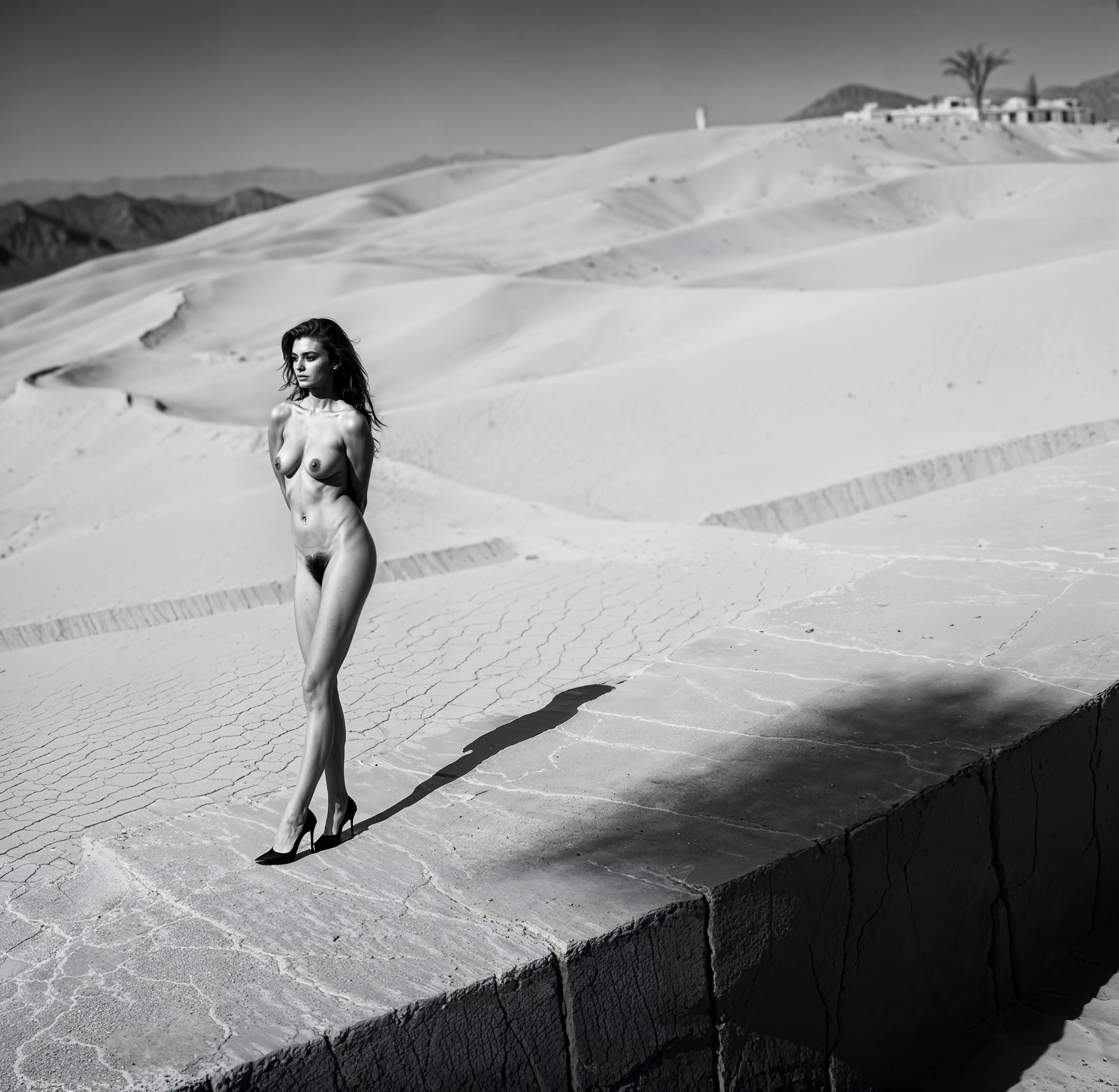 “Edge of the Silent Dunes” is a minimalist black-and-white fine art photograph set in a vast desert landscape where geometry and softness meet. A nude female figure, poised in high heels, stands on the sharp edge of a concrete platform, her body lit by a clear, unforgiving sun. Behind her, endless dunes roll into the distance, punctuated only by a faint settlement and a solitary palm—small markers of life against the sweeping emptiness.