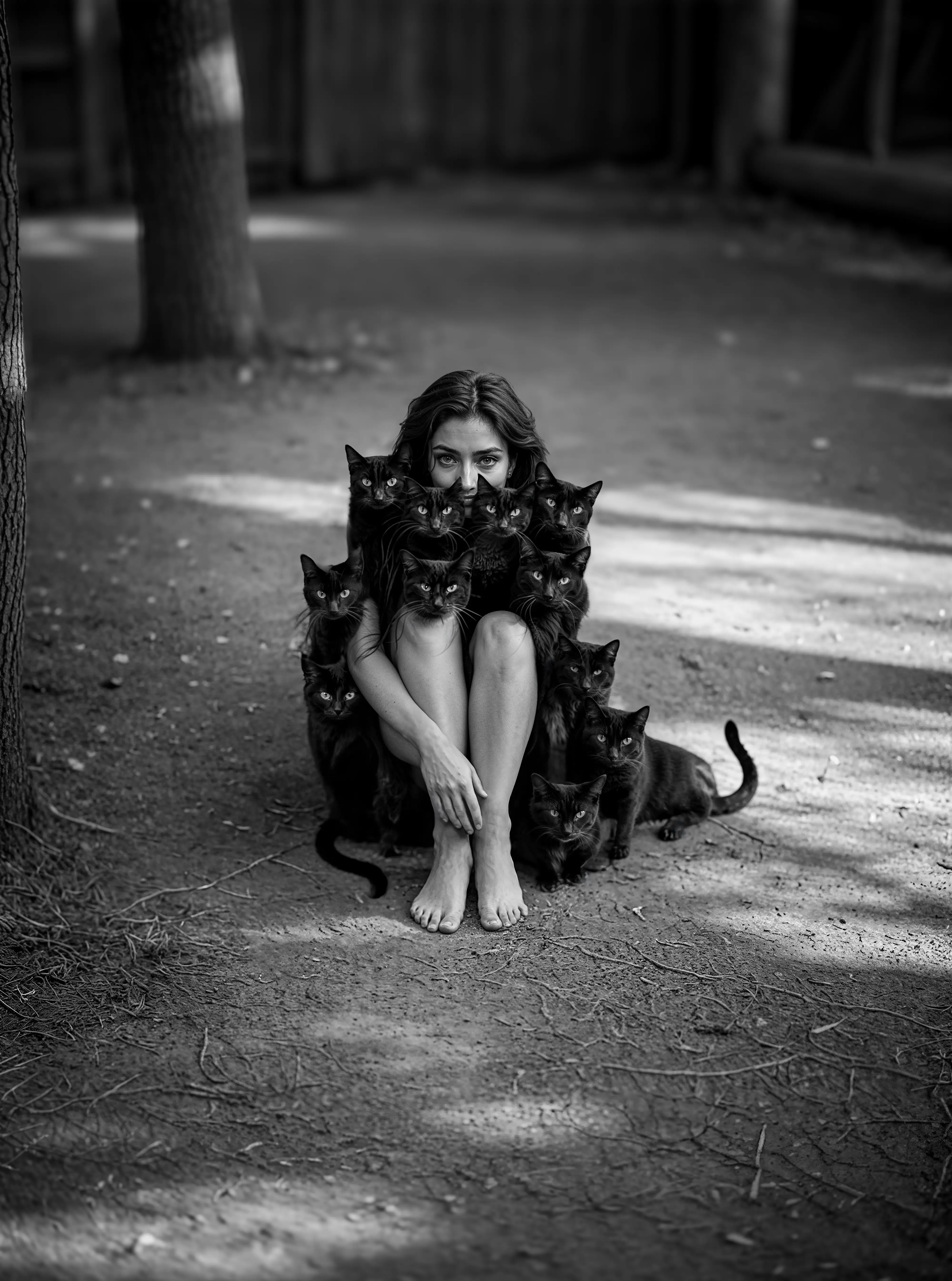 “Circle of Black Cats” is a playful yet quietly enigmatic black-and-white fine art photograph that blends tenderness, mystery, and a hint of surrealism. A seated woman hugs her knees at the center of the frame, surrounded by a cluster of black cats whose eyes all meet the viewer at once, forming a soft, living armor around her body. The blurred background and dappled light on the ground create a calm, everyday setting that makes the scene feel like a dream briefly crossing into ordinary reality.