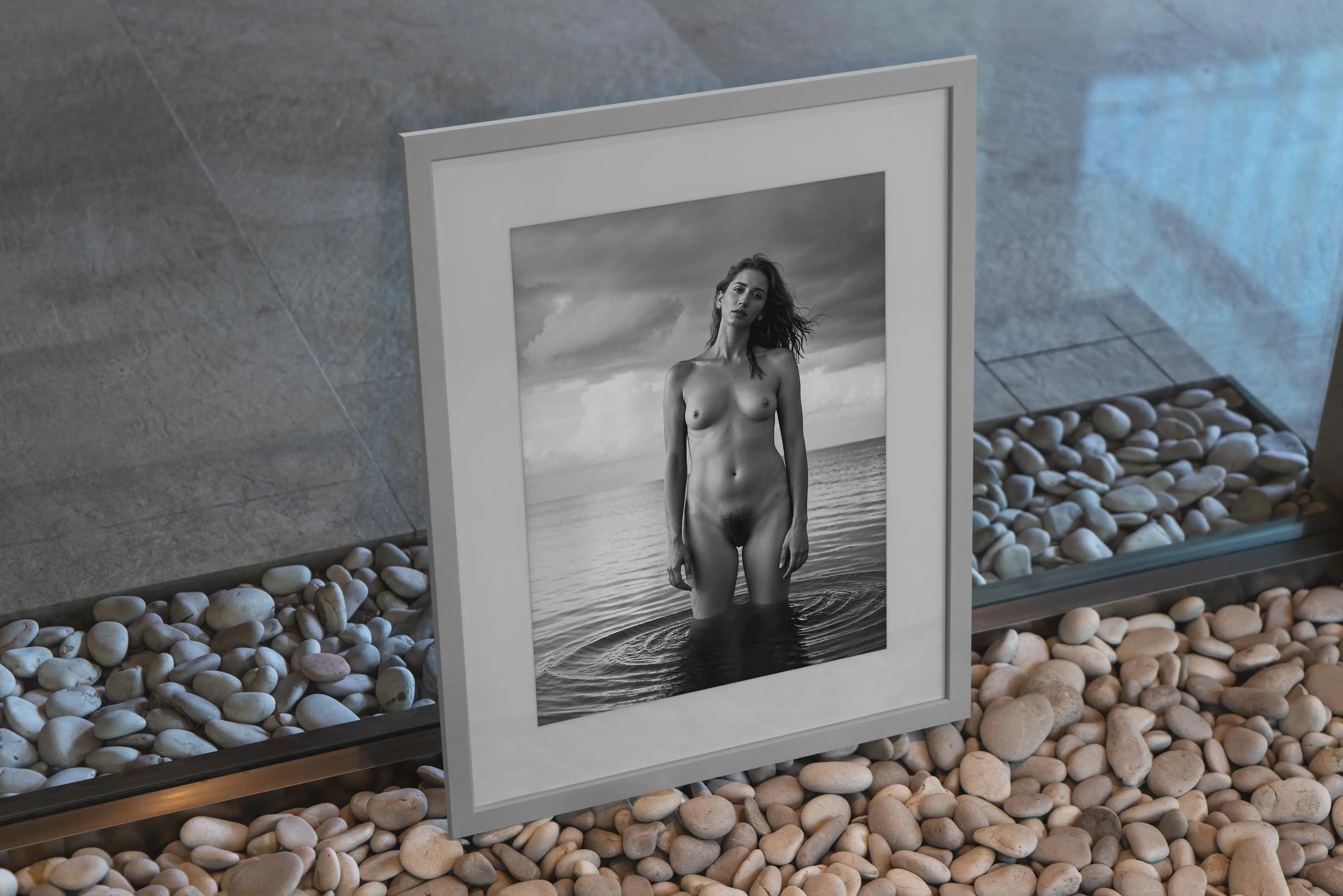 “At the Crest of Silence” is a minimalist black-and-white fine art photograph that captures the stillness of a solitary figure in an endless desert. A nude woman stands on the ridge of a sweeping dune, her body small yet unmistakably present against a vast, luminous sky. The wind-shaped sand below her falls away in dark, velvety shadow, its surface traced with delicate lines and ripples that echo the contours of her form.