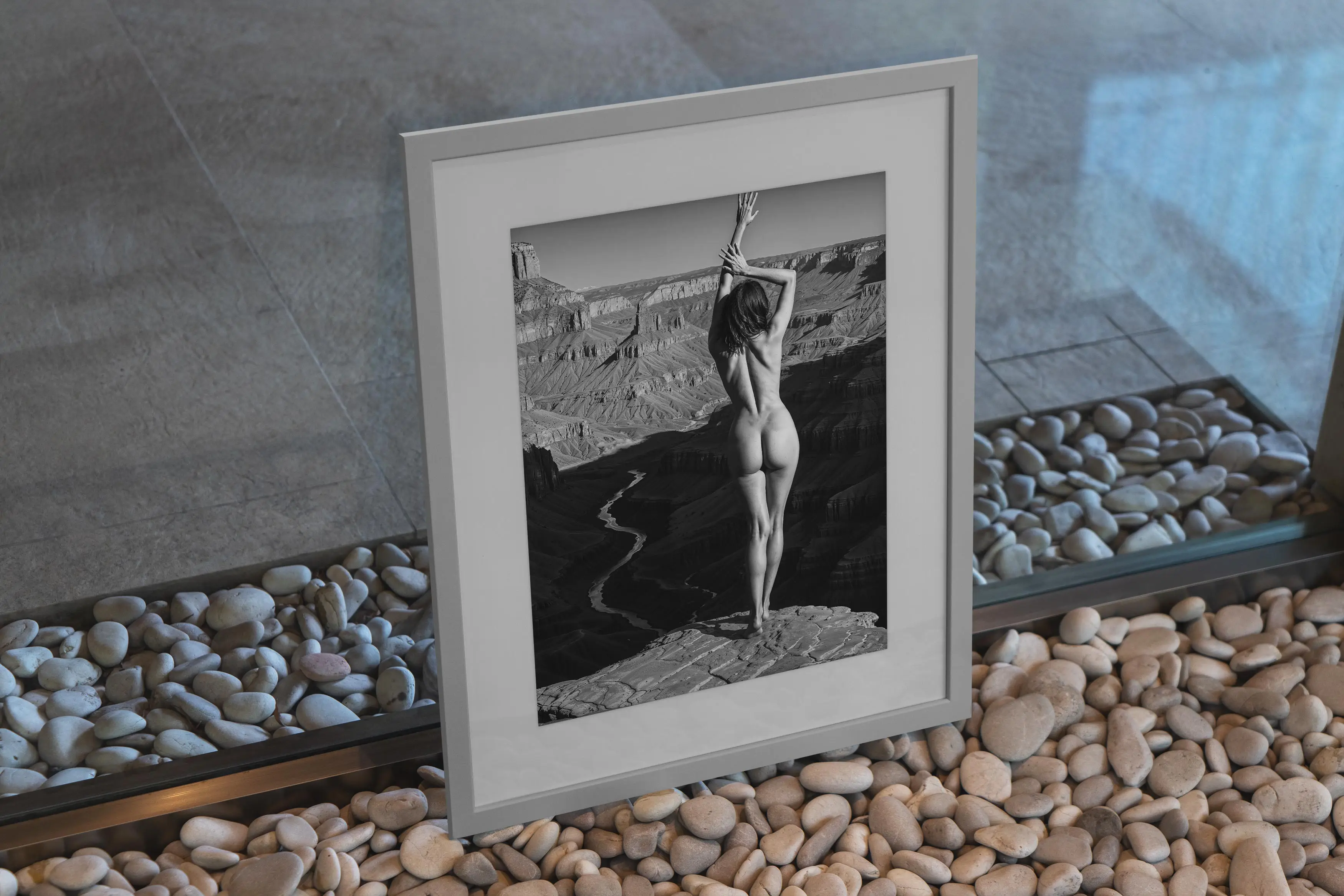 “Under the Gathering Sky” is a moody black-and-white fine art photograph capturing the stillness that exists just before something shifts. A nude figure stands waist-deep in calm water, her body relaxed yet alert, eyes meeting the viewer with a quiet, searching gaze. Behind her, the horizon stretches in a thin, delicate line while dramatic storm clouds loom overhead, reflected softly in the rippling surface around her legs.