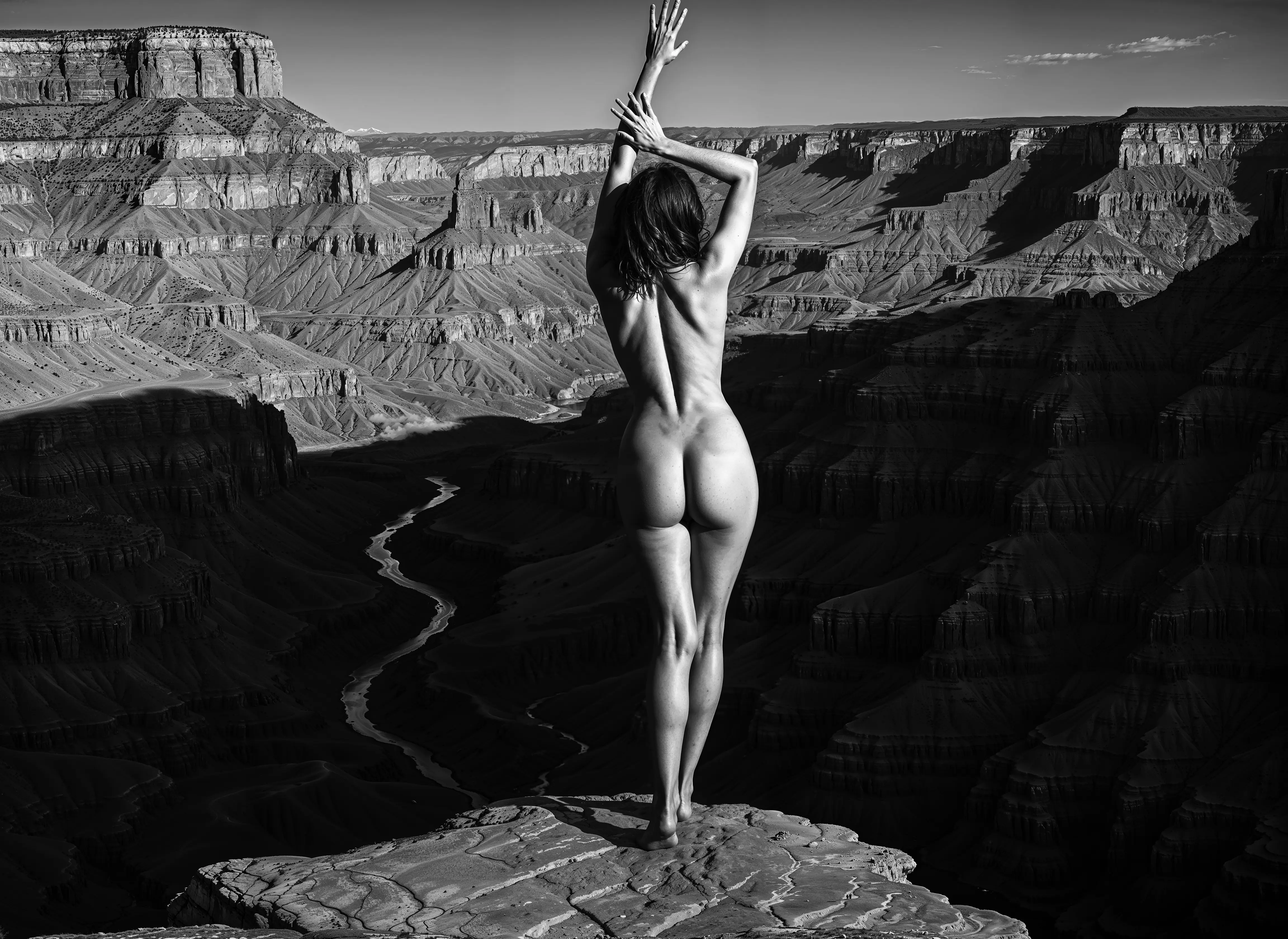 She stands at the canyon’s edge, arms lifted to the sky as the river winds far below like a memory she has finally outgrown.
